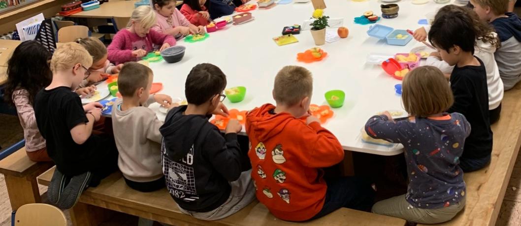 Zum Abschluss unserer Unterrichtsreihe haben wir gesunde Brote geschmiert. Die sahen total lustig aus, weil wir mit Gemüse, Gesichter auf das Brot gelegt haben. Bevor wir unsere Brote gegessen haben, haben wir unsere Partnerklasse, die Mäuse, zu uns eingeladen.